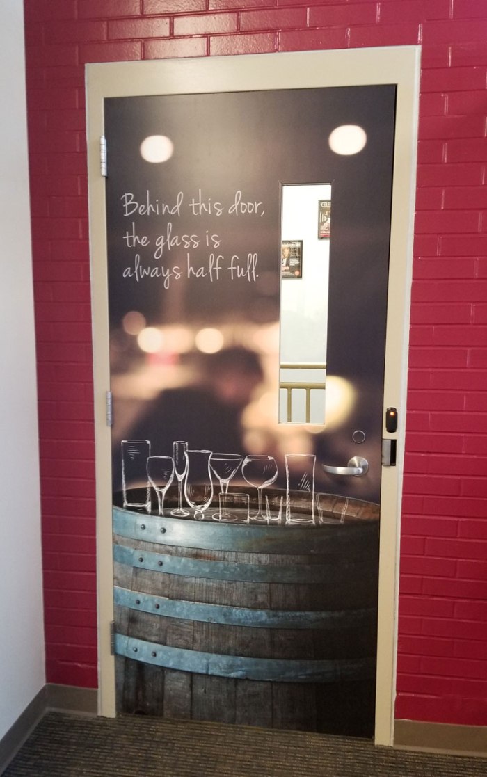 The goal of this project was to bring more excitement to a boring space, the client’s entrance to their marketing department. This installation included an original door wrap design, art direction for the wall coloring, as well as vendor collaboration.